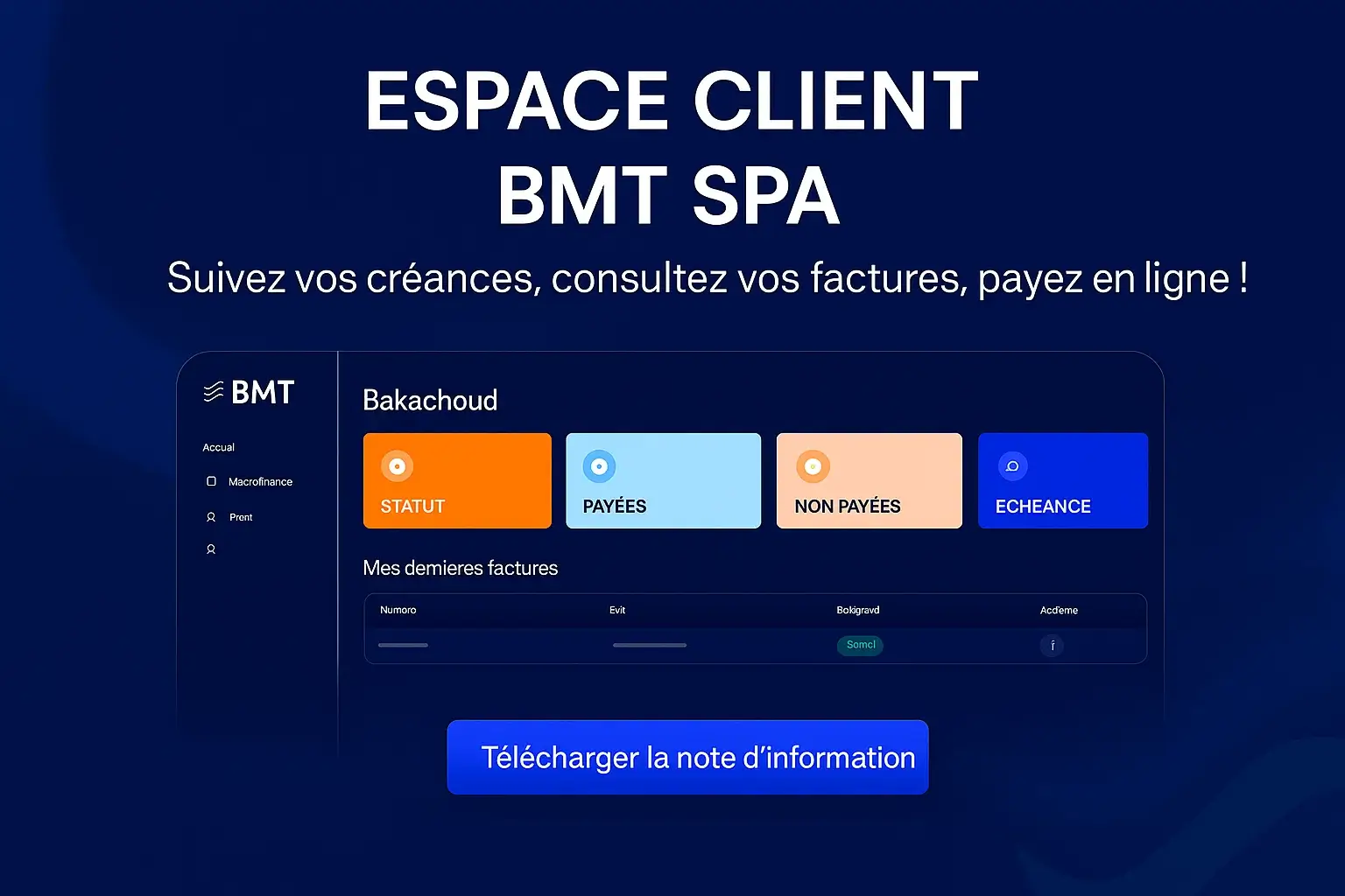Dans le cadre de l’amélioration continue de nos services et afin de faciliter vos opérations de paiement, nous avons le plaisir de vous informer que BMT Spa met à votre disposition un espace client en ligne …